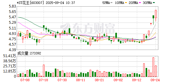 *ST花王再度涨停,6个交易日内录得4个涨停,累计涨幅为22.06%,累计换手率为29.39%。截至9:42,该股今日成交量1781.50万股,成交金额9971.23万元,换手率3.56%。最新A股总市值达49.98亿元,A股流通市值28.49亿元。